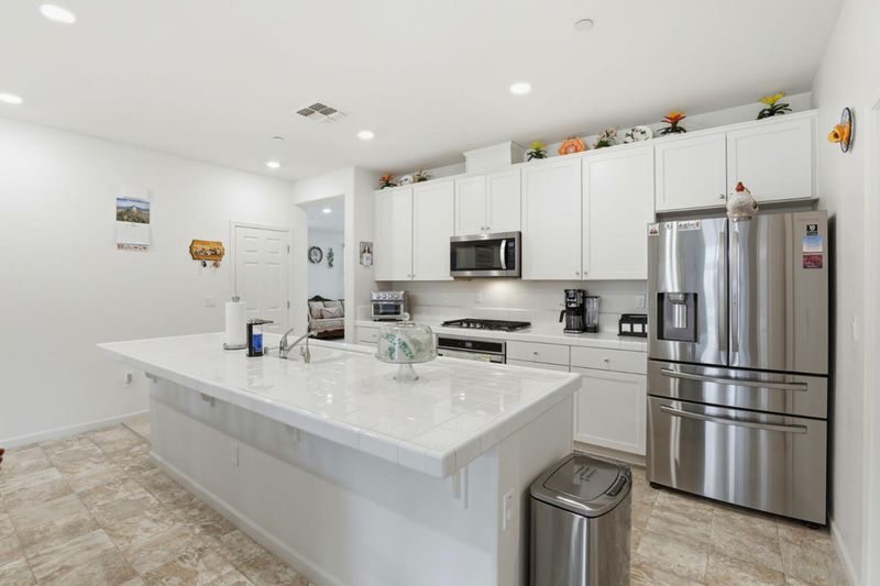 Countertop - Tile, Dishwasher, Exhaust Fan, Garbage Disposal, Hood Over Range, Island with Sink, Microwave, Oven Range, Pantry