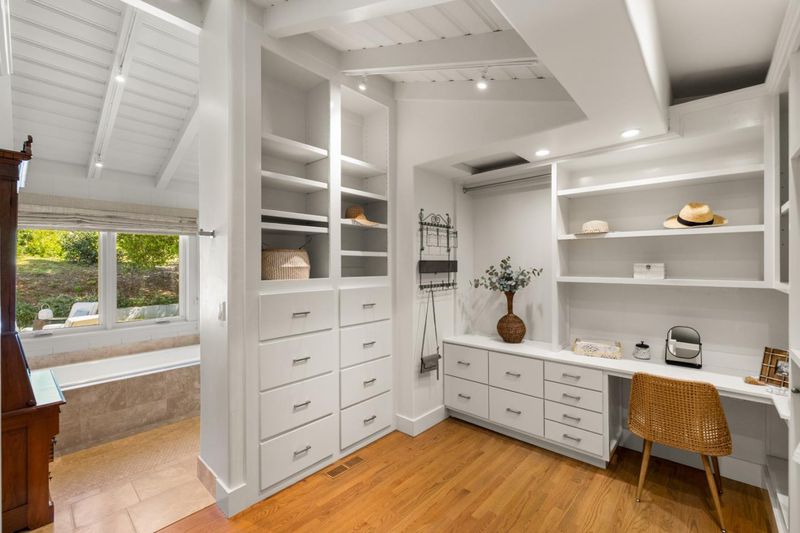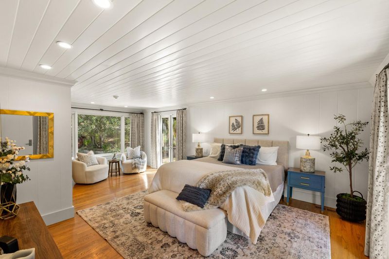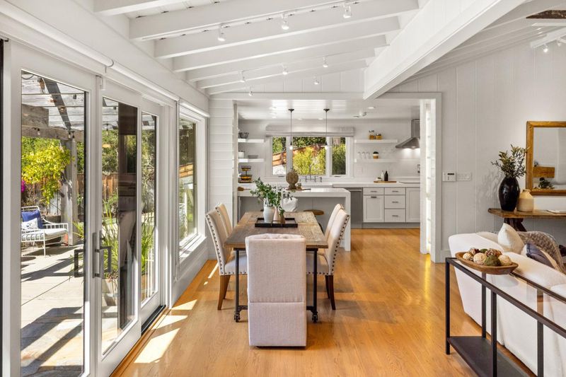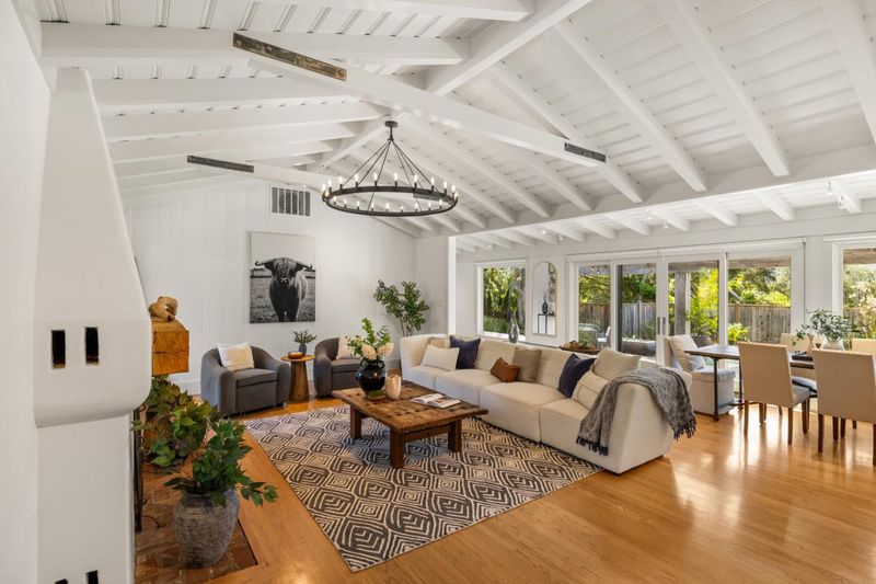 Nestled beneath ancient oaks with sweeping mountain views, this impeccably reimagined California ranch estate offers a rare blend of privacy, beauty, and sophistication. The 2,297 sq ft single-story main residence features soaring vaulted beam ceilings, wide-plank hardwood floors, and walls of glass that open to a stunning pool and gardens. The bright chef's kitchen features quartz countertops, a farmhouse sink, and custom cabinetry. The generous primary suite includes direct garden access, a spa-inspired bath with soaking tub, glass shower, and a custom walk-in dressing room. Outside, a string-lit pergola terrace runs the length of the home, terraced steps lead to a sparkling pool framed by lavender and mountain views, and a raised-bed kitchen garden adds charm and function. The detached guest quarters offer flexibility for guests, extended family, or a studio. A stone court with a fountain, mature oaks, and vibrant bougainvillea completes these incredible grounds.