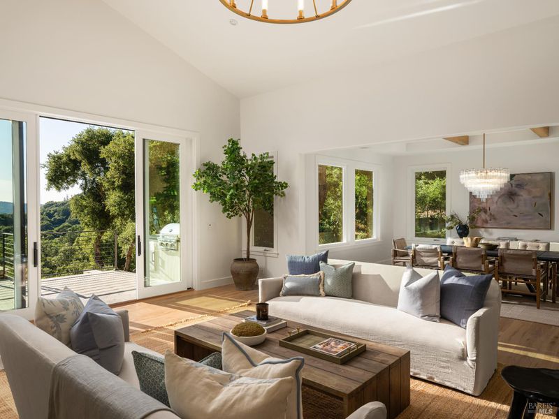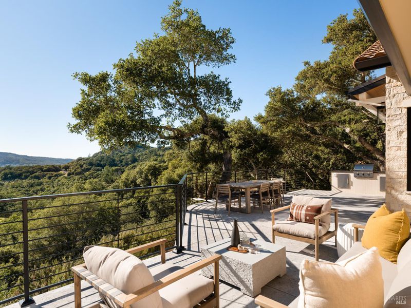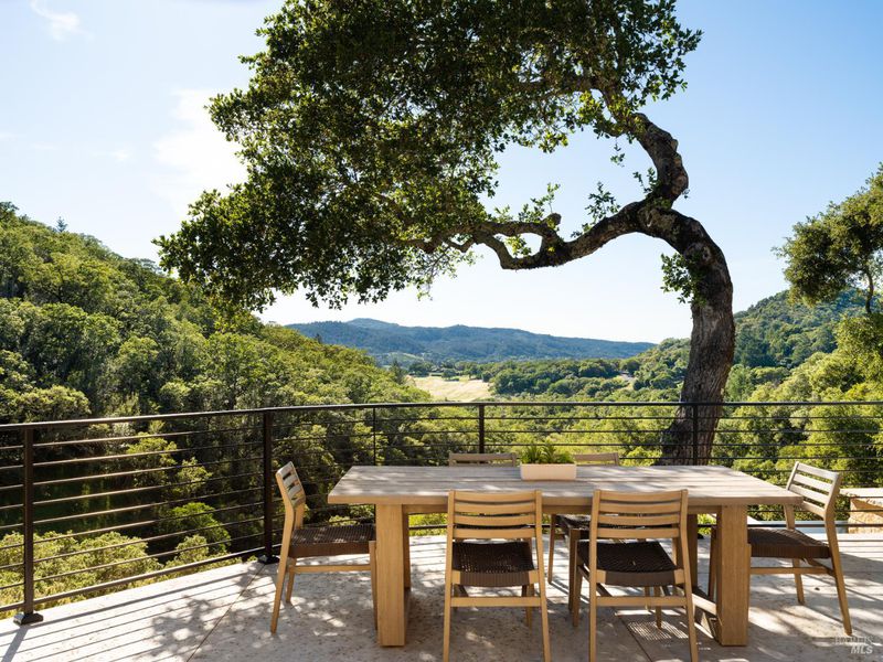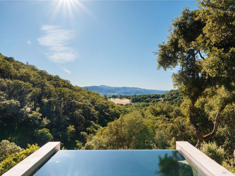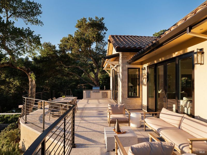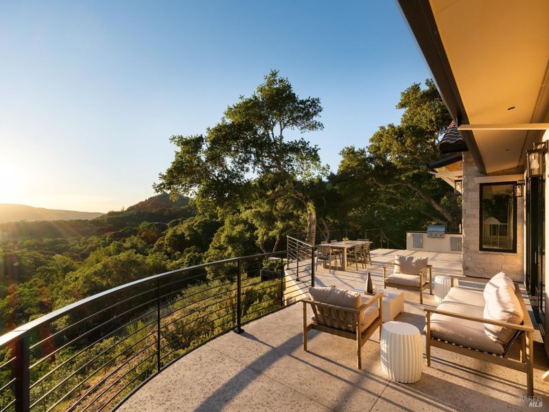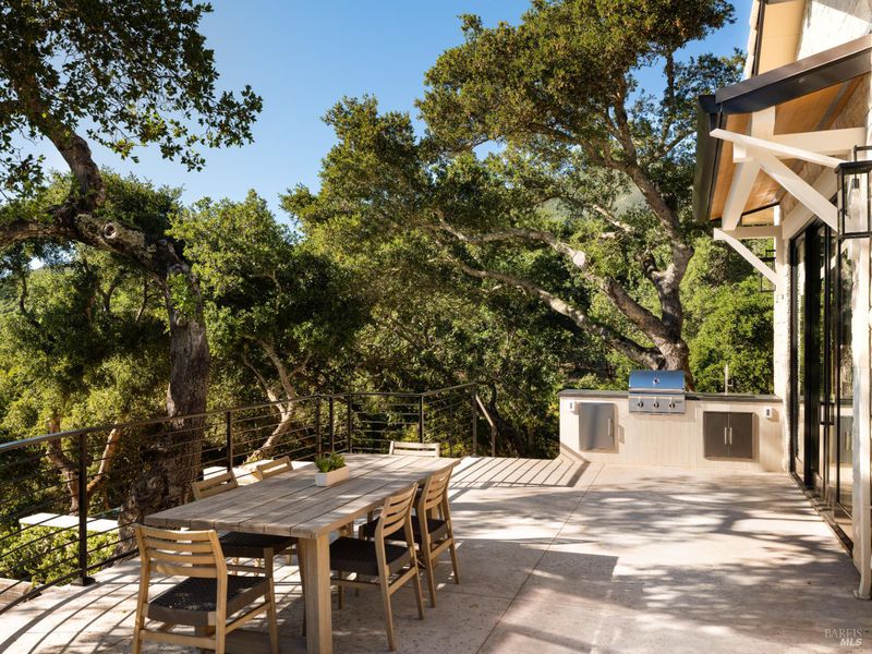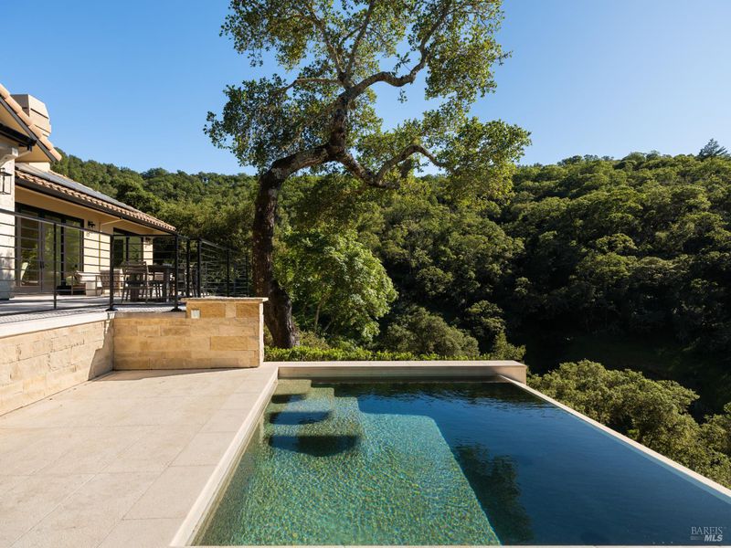 Set on approximately 6.74 acres, this 3,807 +/- sq ft home offers expansive views, privacy, and a strong indoor-outdoor connection. Reimagined by MG Taylor Design, the residence features tall ceilings, a 12-foot entry, and a layout designed for flow and entertaining. Interiors include walnut cabinetry, rift white oak vanities, antique oak beams, Thermador appliances, and a wet bar. The home includes a total of 3 bedrooms, 3 bathrooms split between the main house and guest house. Outdoor spaces include a large rear patio, plunge pool, BBQ island, private primary balcony and patio, plus a flagstone patio among the trees. The landscape incorporates drought-resistant plantings aligned with the natural surroundings. Solar system with Tesla Powerwalls and a 3-car garage complete the property.
