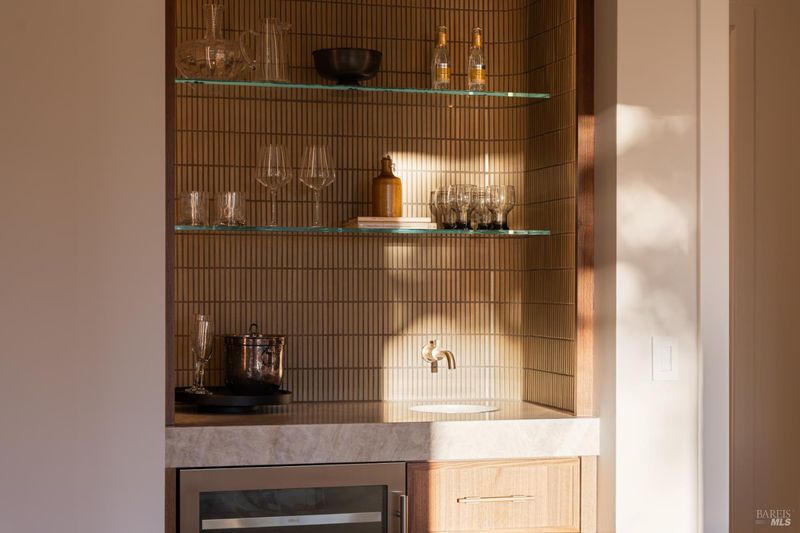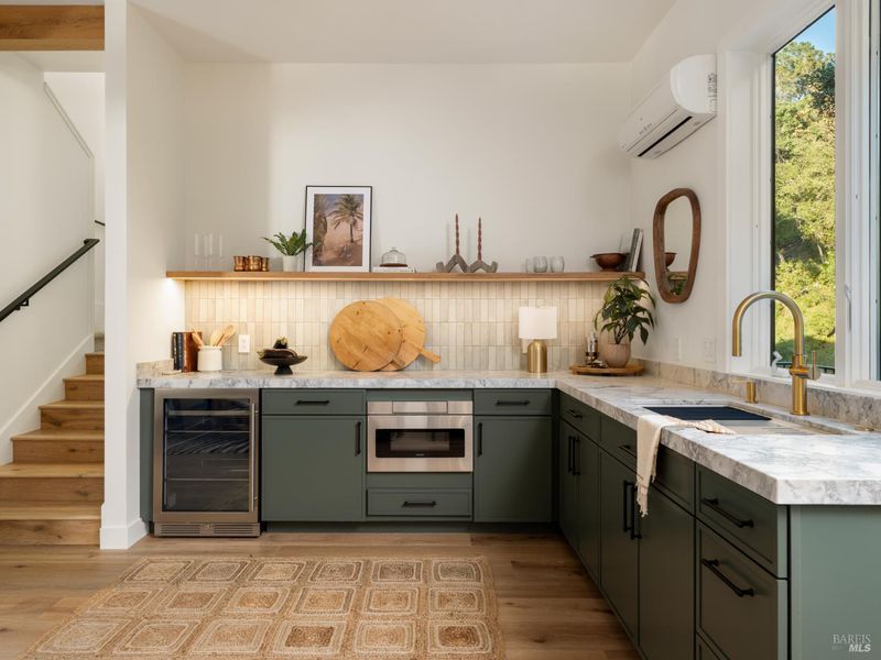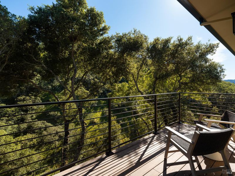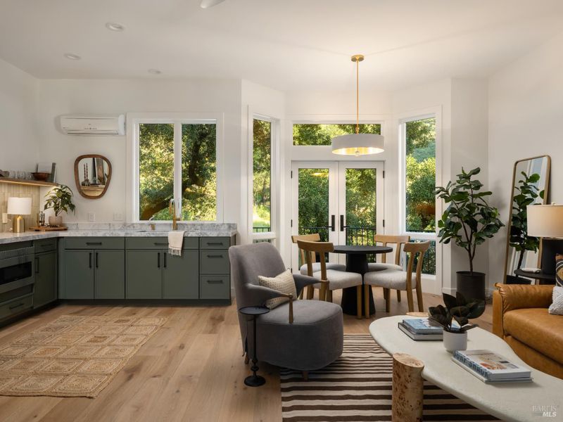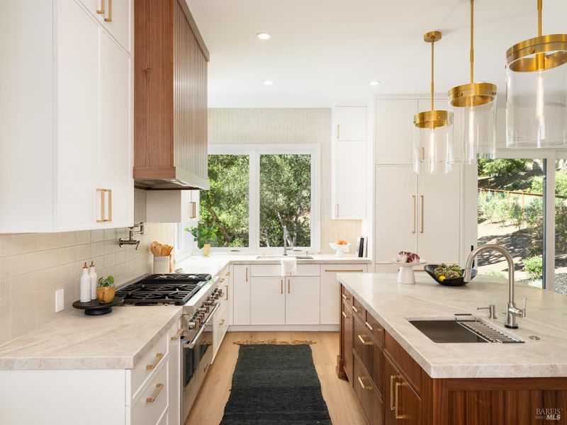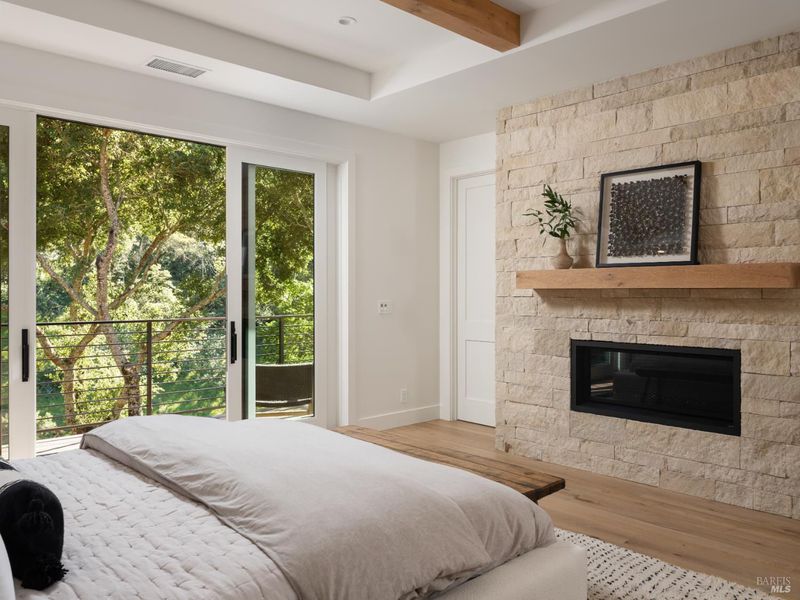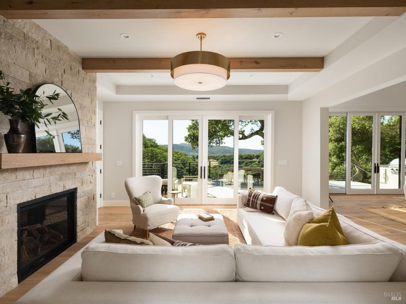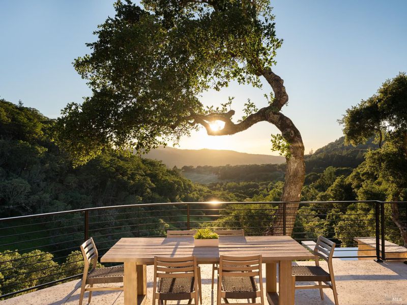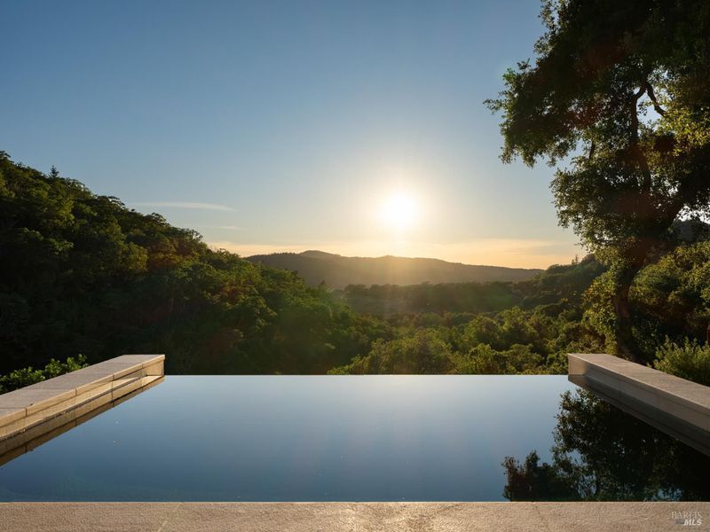 Set on approximately 6.74 acres, this 3,807 +/- sq ft home offers expansive views, privacy, and a strong indoor-outdoor connection. Reimagined by MG Taylor Design, the residence features tall ceilings, a 12-foot entry, and a layout designed for flow and entertaining. Interiors include walnut cabinetry, rift white oak vanities, antique oak beams, Thermador appliances, and a wet bar. The home includes a total of 3 bedrooms, 3 bathrooms split between the main house and guest house. Outdoor spaces include a large rear patio, plunge pool, BBQ island, private primary balcony and patio, plus a flagstone patio among the trees. The landscape incorporates drought-resistant plantings aligned with the natural surroundings. Solar system with Tesla Powerwalls and a 3-car garage complete the property.